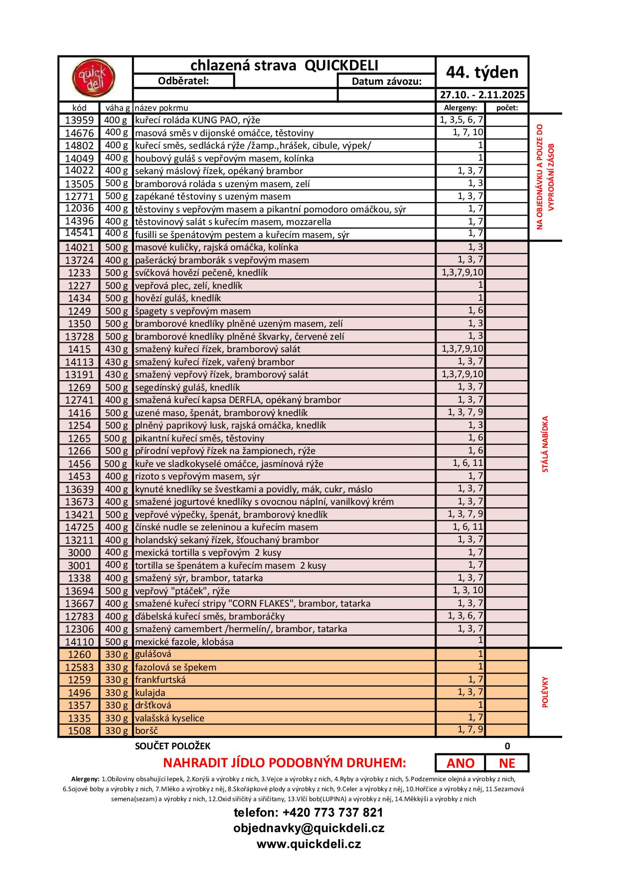 Jídelní lístky s objednávkou, prosím, zasílejte pouze ve formátu XLS – SOUBOR EXCEL/v tom Vám JL i přijde/. Vyplňte pouze kusy jídel a polévek ve sloupečku POČET. Dole máte možnost vybrat, zda chcete NAHRADIT jídlo podobným druhem, či nikoliv/nenahrazovat/ - pokud nechci náhradu jídla – nechám v tabulce NE, ano smažu.
